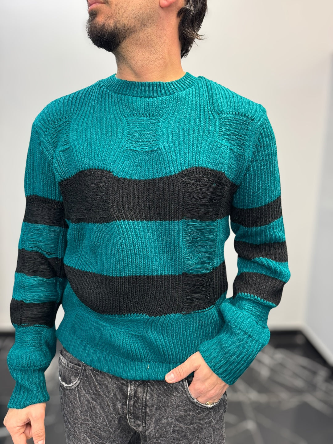 Questo maglione è l’essenza della moda ribelle: le rotture strategiche presenti in alcune zone creano un effetto vissuto e autentico, perfetto per chi vuole distinguersi con un tocco di carattere. Le strisce irregolari, disponibili in tre varianti di colore, aggiungono dinamismo e personalità, rendendo ogni look unico e originale.veste regolare
