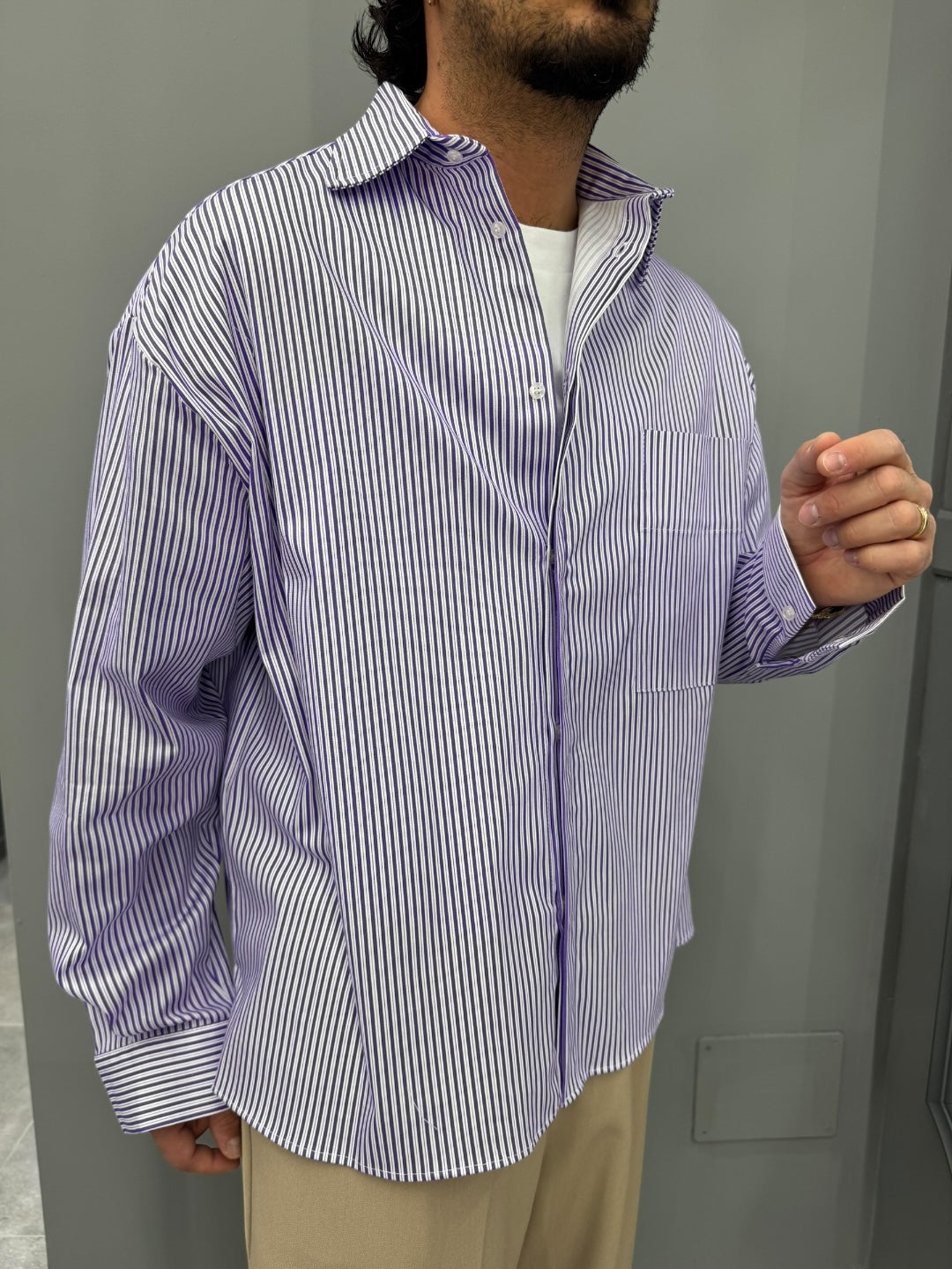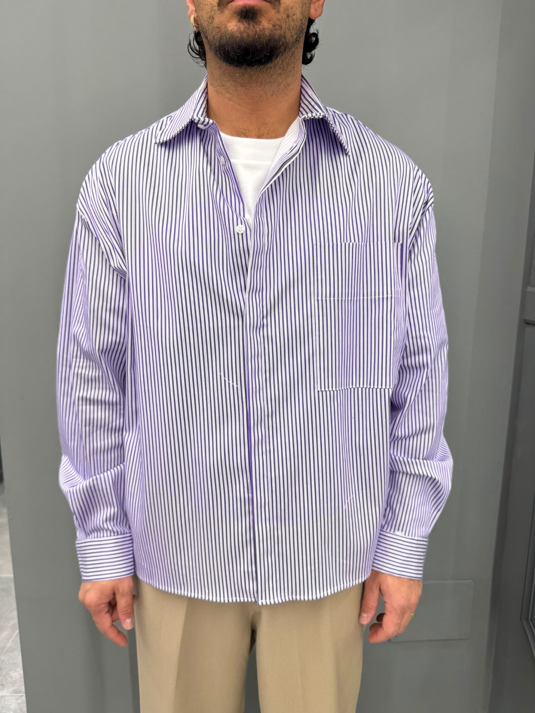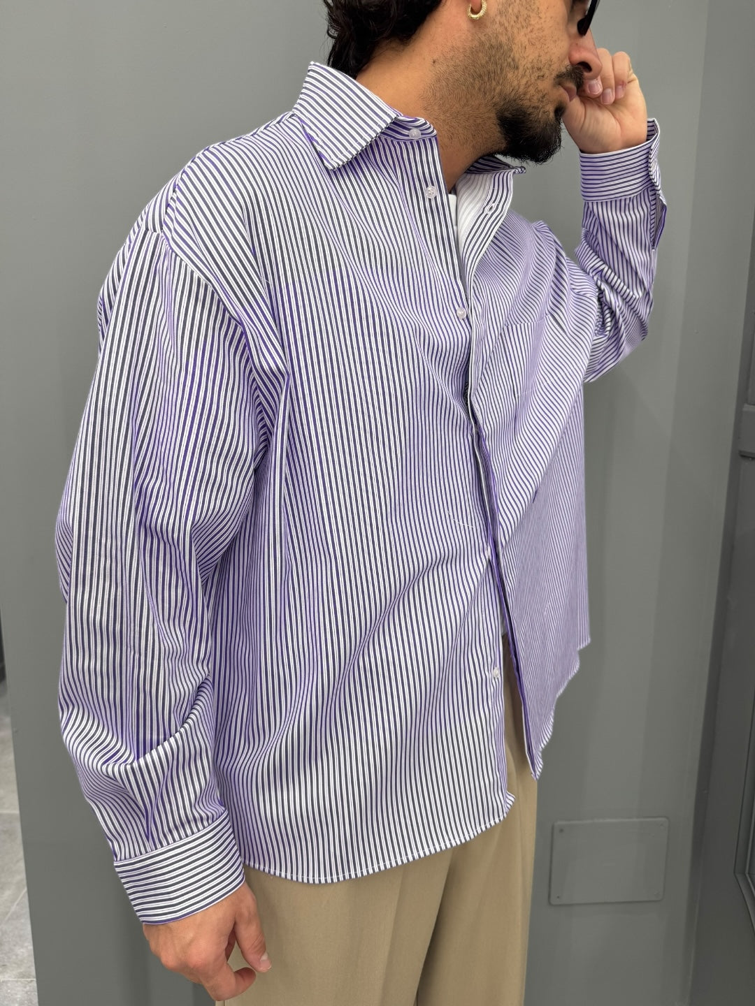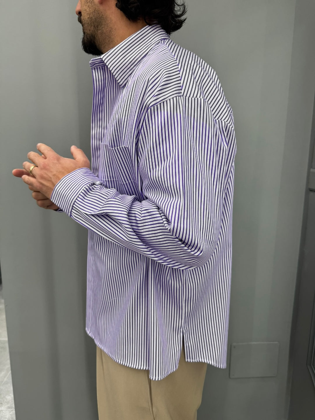 Camicia a righe dalla vestibilità over e rilassata, realizzata in cotone leggero e confortevole. Il design a righe sottili in tonalità viola dona un tocco distintivo e moderno, ideale per outfit casual ma curati. Colletto strutturato, taschino frontale e spacchi laterali completano un capo versatile da indossare aperto con una t-shirt o chiuso per un look più pulito.