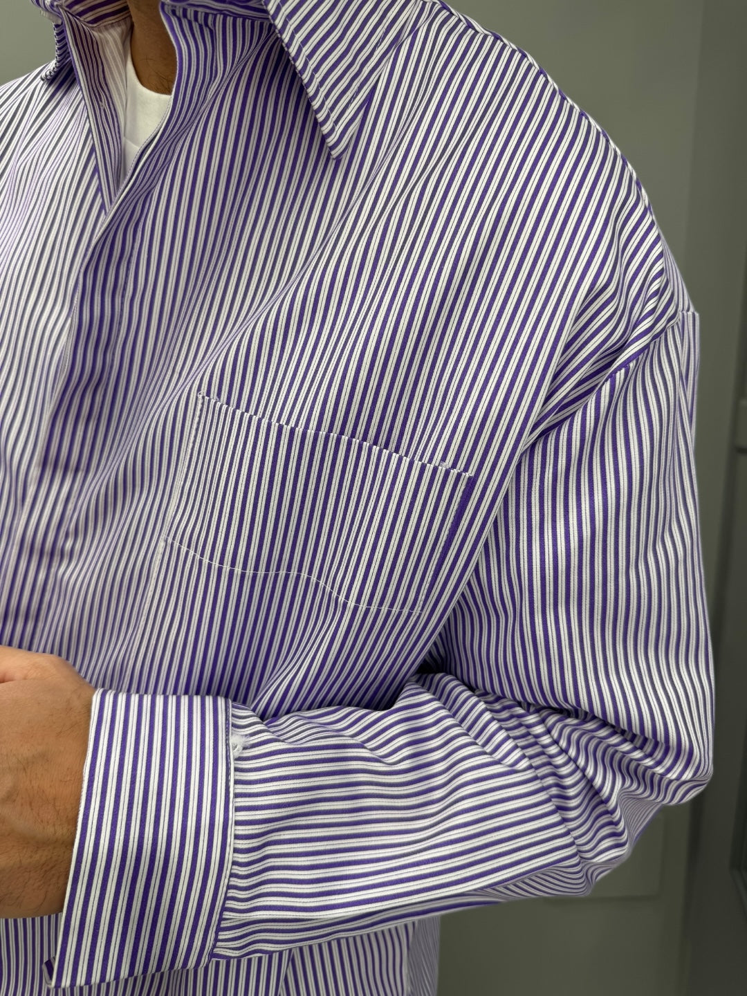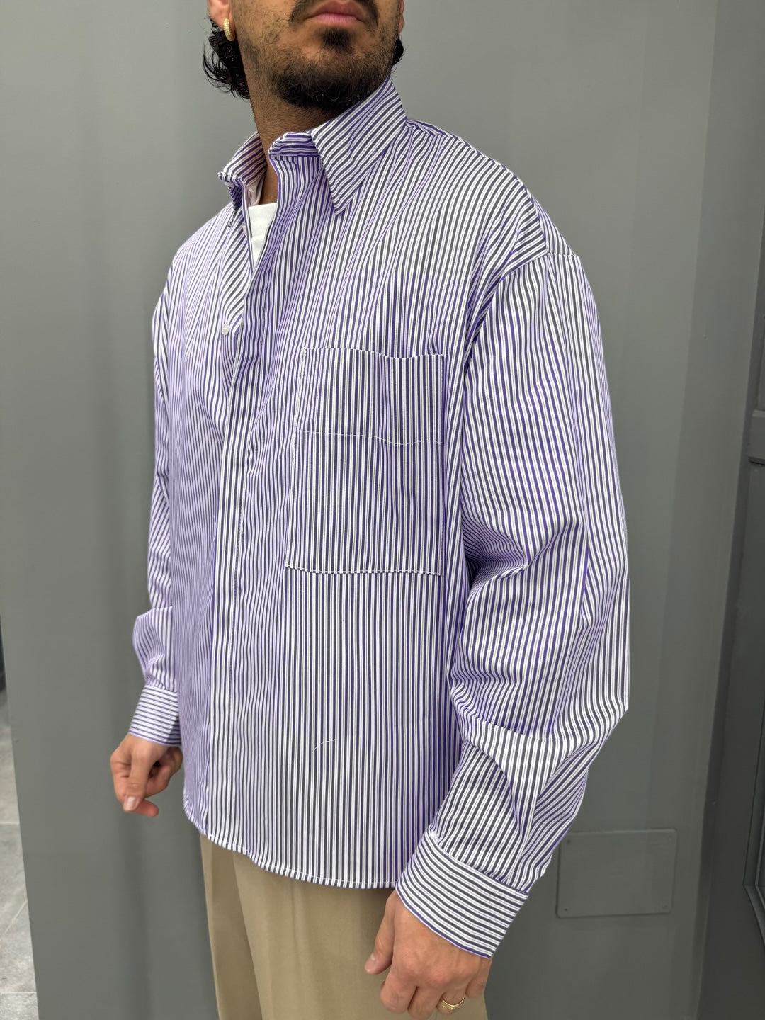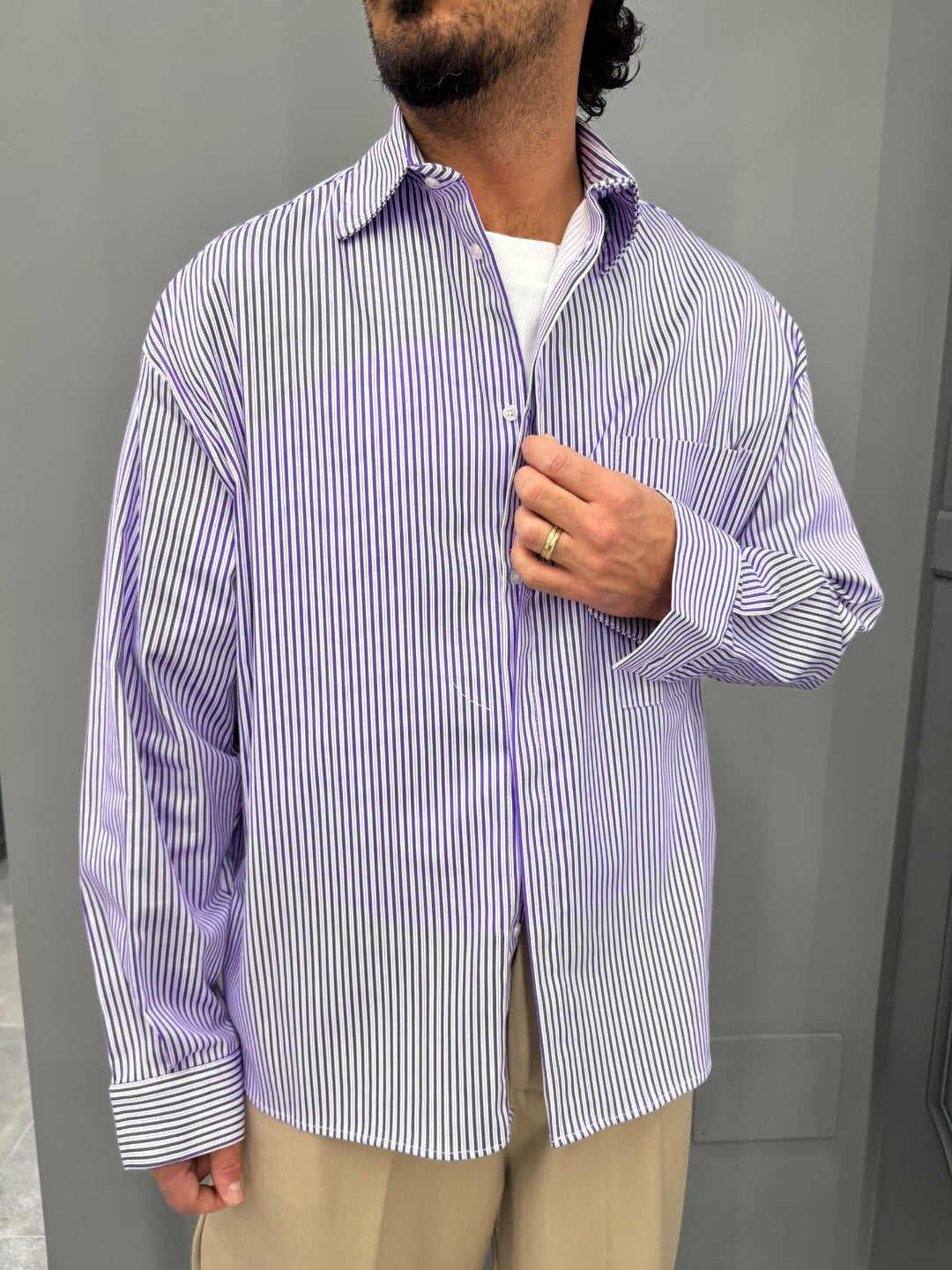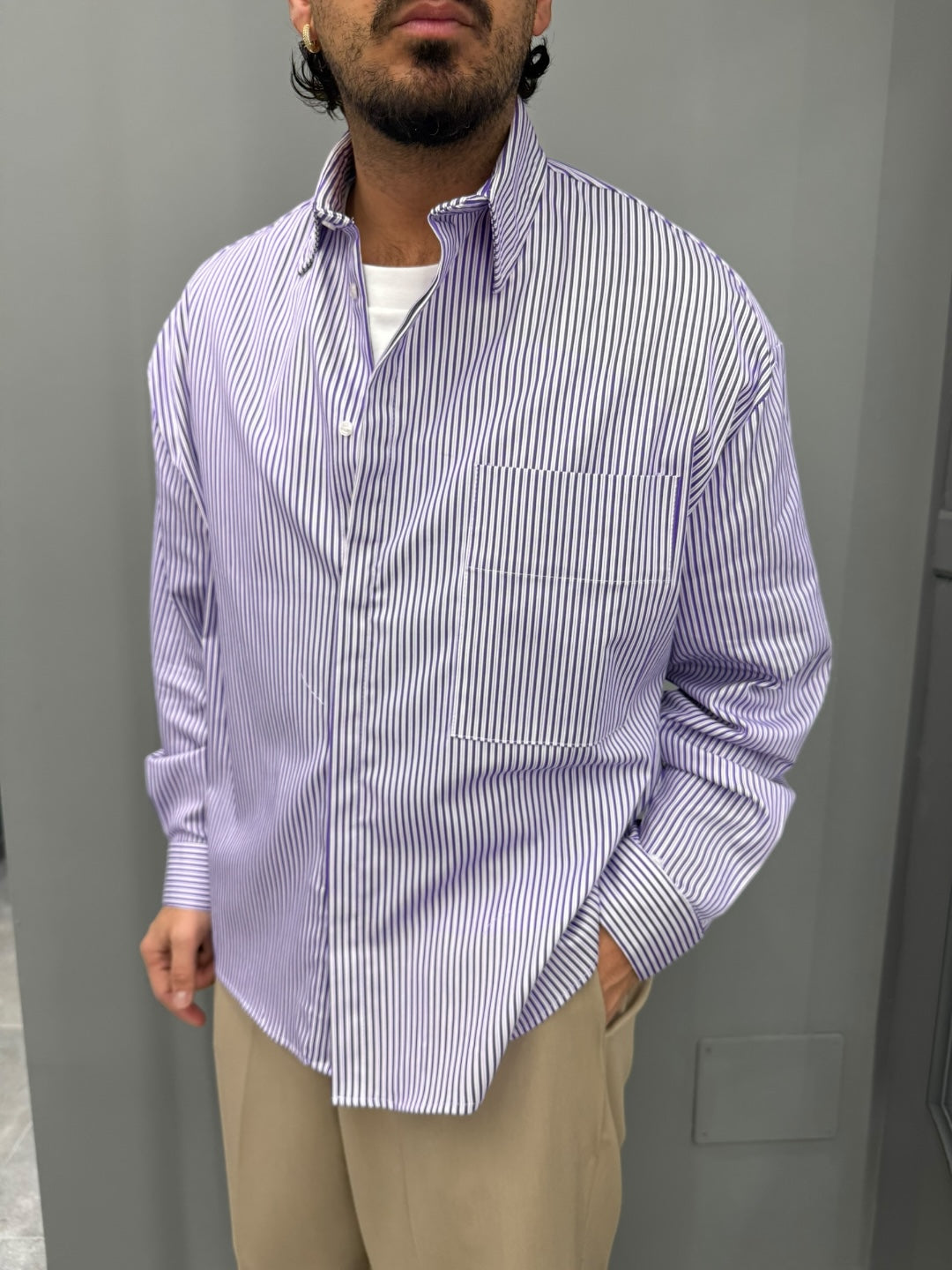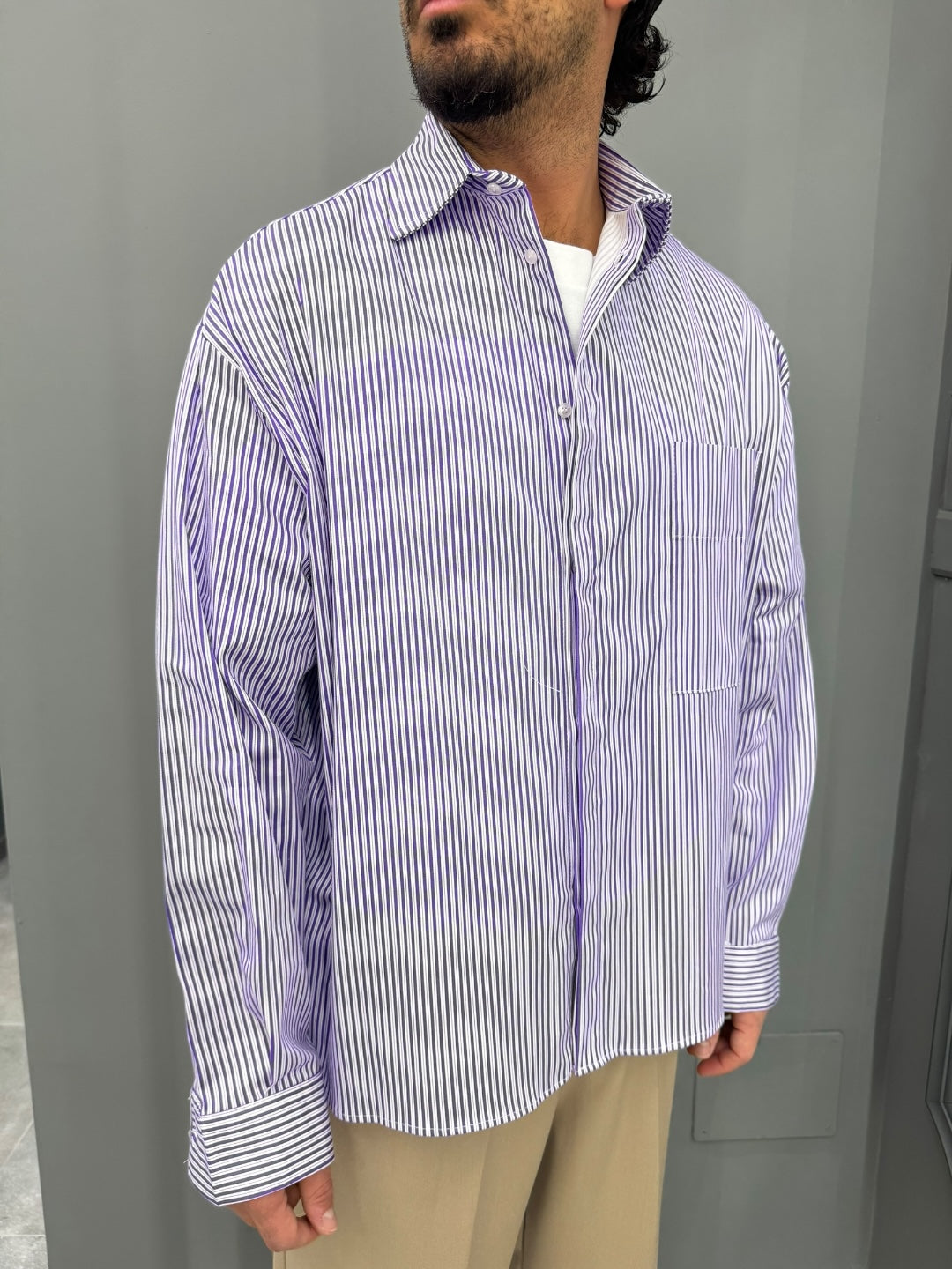 Camicia a righe dalla vestibilità over e rilassata, realizzata in cotone leggero e confortevole. Il design a righe sottili in tonalità viola dona un tocco distintivo e moderno, ideale per outfit casual ma curati. Colletto strutturato, taschino frontale e spacchi laterali completano un capo versatile da indossare aperto con una t-shirt o chiuso per un look più pulito.
