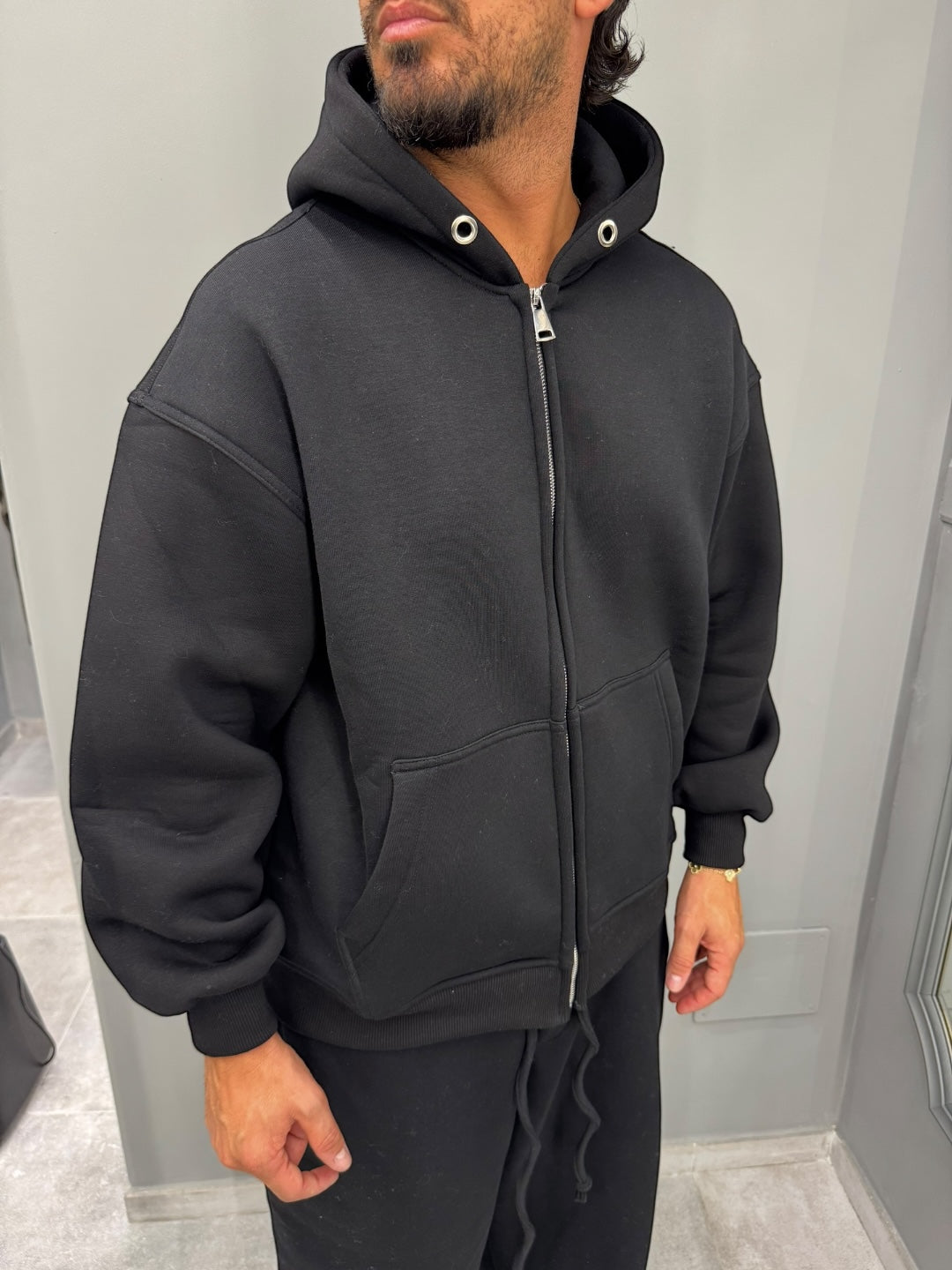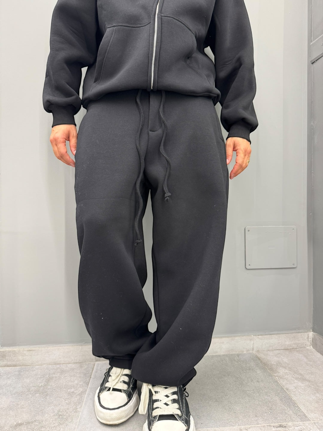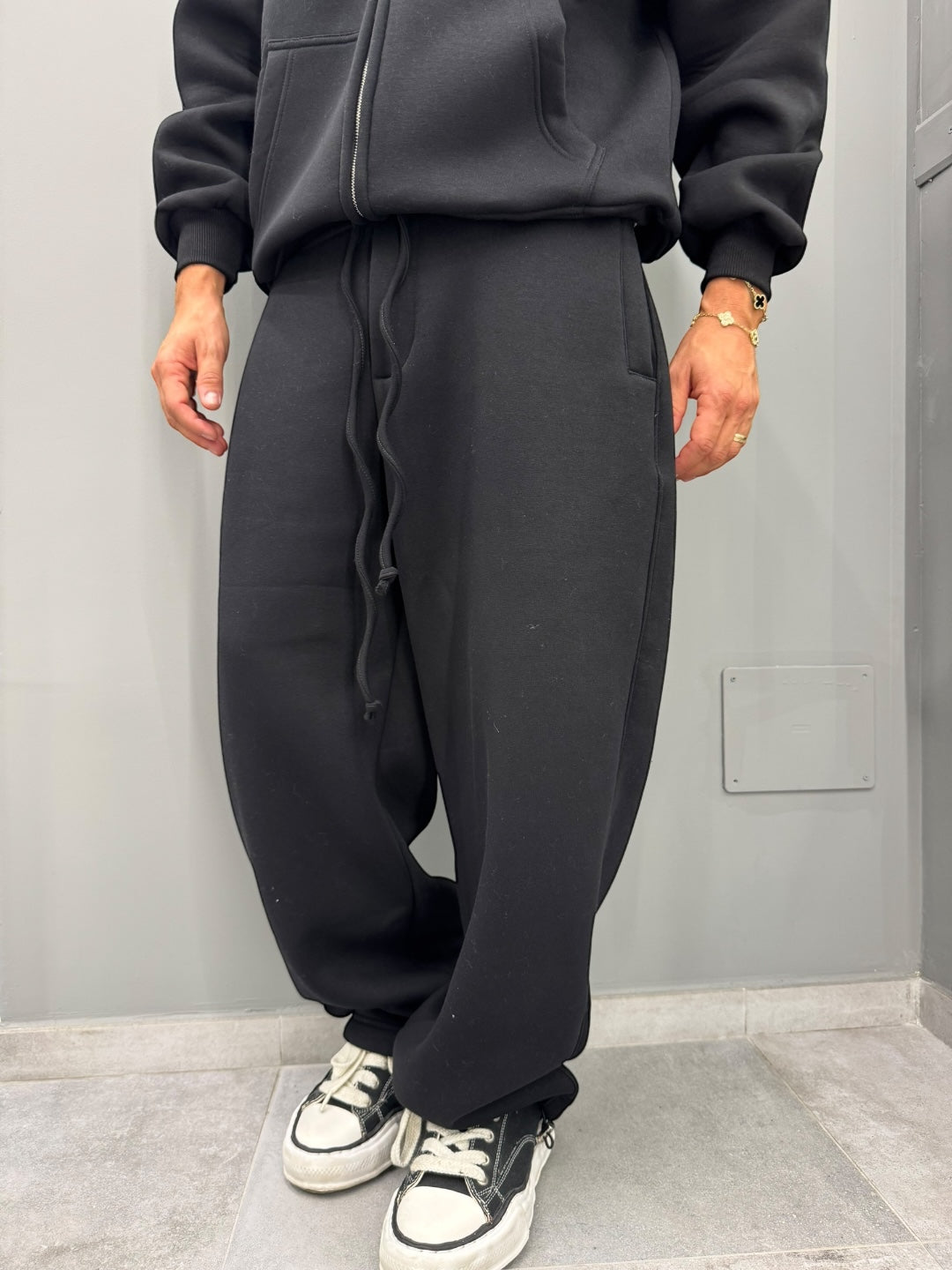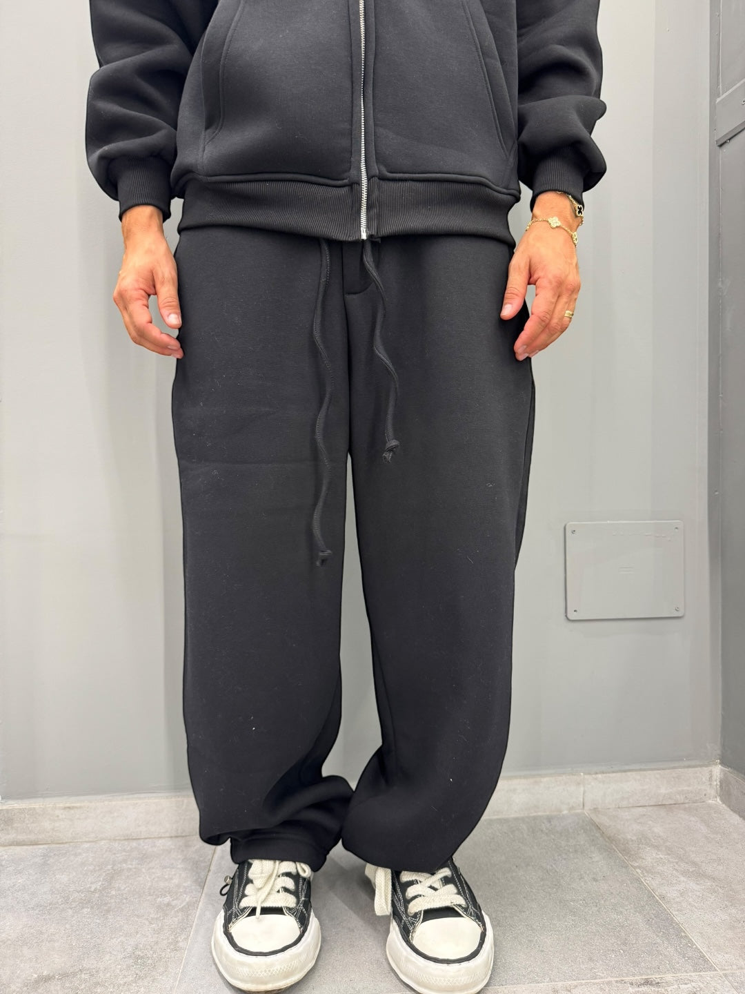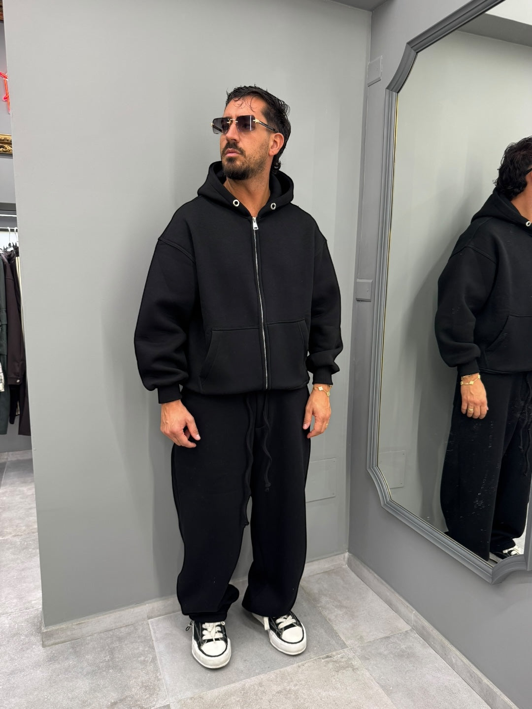 La felpa con zip frontale e cappuccio integrato offre una vestibilità ampia e comoda, con polsini elastici che assicurano una tenuta perfetta senza rinunciare alla libertà di movimento. I pantaloni presentano una linea moderna e rilassata, con coulisse regolabile in vita per adattarsi a ogni silhouette e donare un tocco di stile urban.