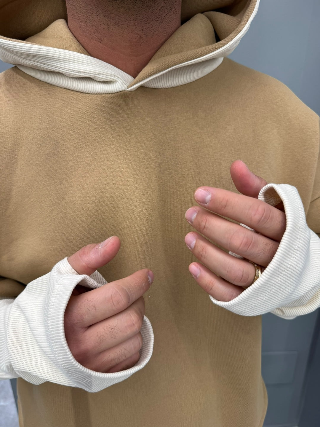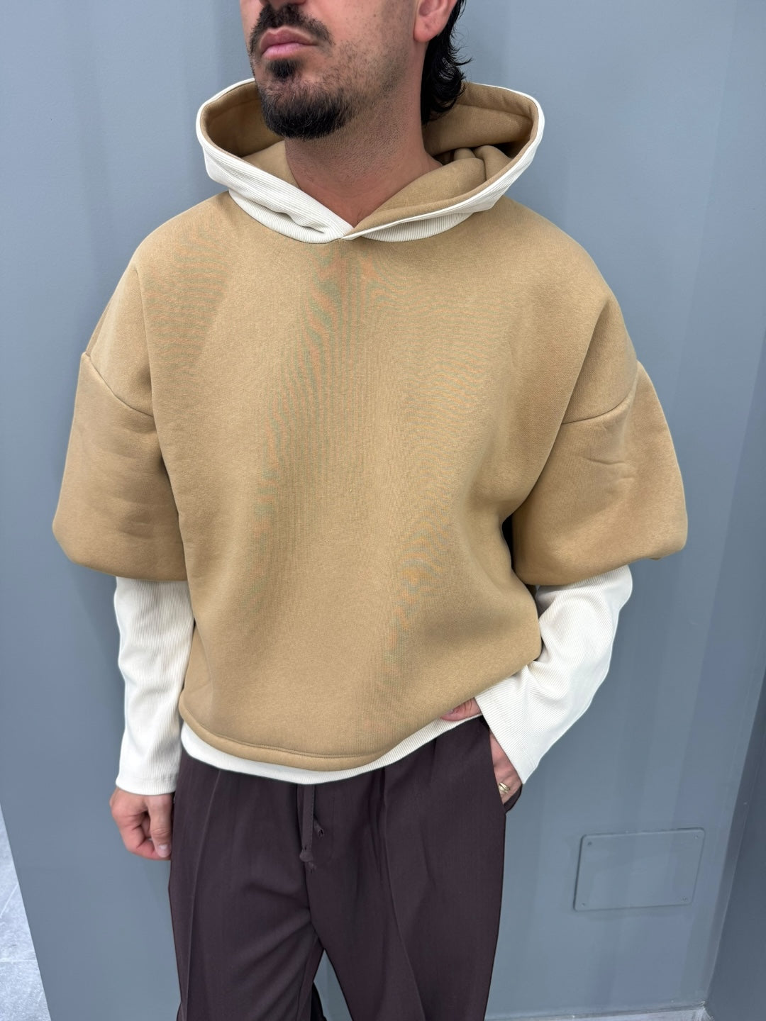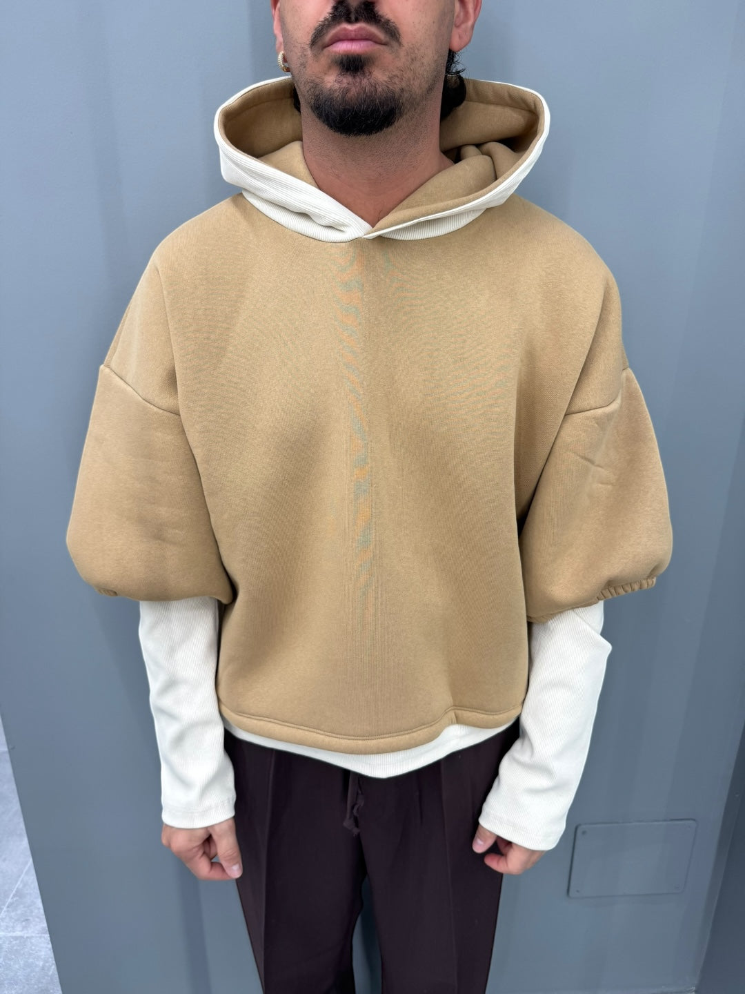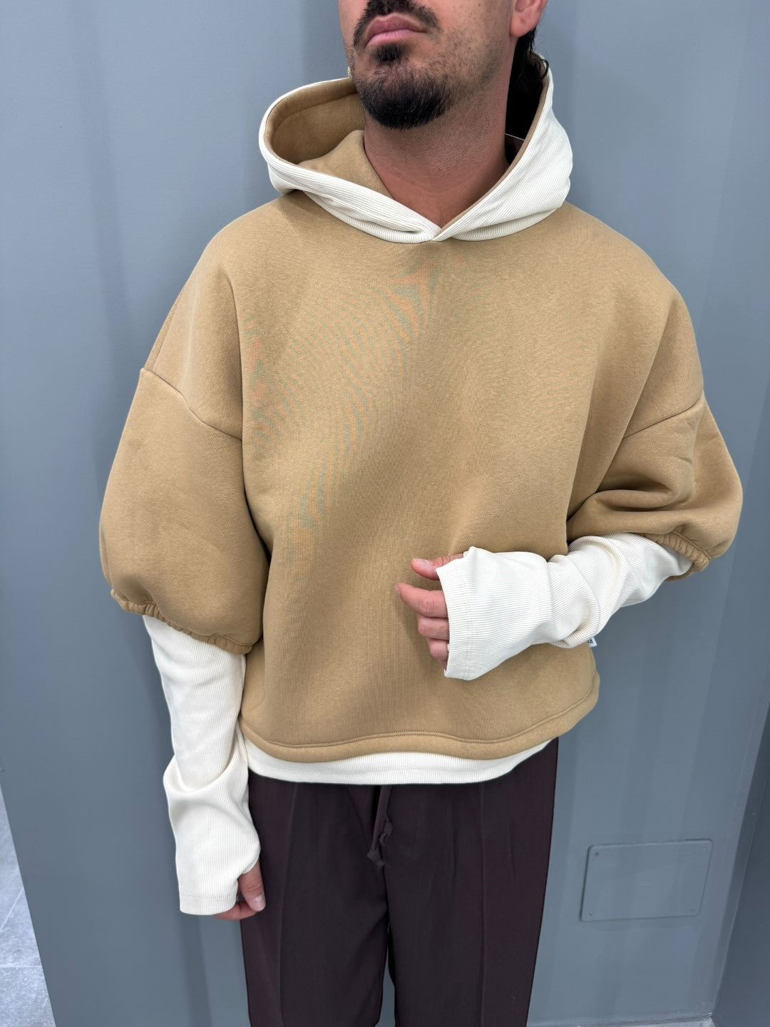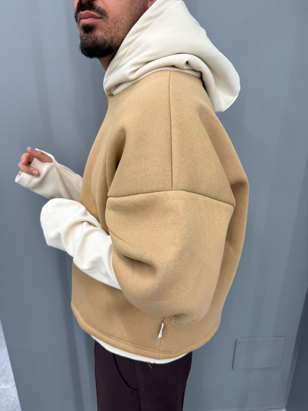 Realizzata in un morbido tessuto camel a contrasto con l’interno e le maniche off-white, questa felpa gioca con sovrapposizioni e proporzioni per creare un look contemporaneo e di forte personalità. Le maniche lunghe estese, leggermente arricciate all’interno della manica esterna, donano un effetto layered naturale e di tendenza. Il cappuccio strutturato, morbido e avvolgente, aggiunge una nota street ma elegante.